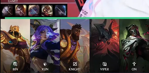 BLG选用:Bin奎桑提;Xun剑魔;Knight沙皇;Viper芸阿娜;ON烈娜塔