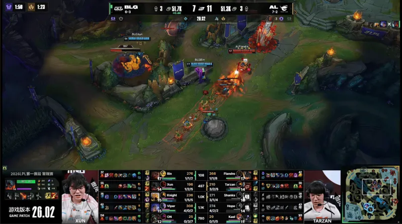 26分钟,Tarzan强开Knight失败,BLG先后击杀Hope与Shanks