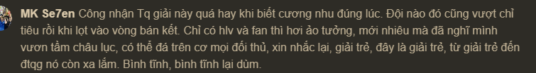 这位叫MK的球迷暗讽越南队道:必须承认,中国队在这场比赛中表现非常出色,能够在恰当的时机刚柔并济。某些球队能够闯入半决赛,其实已经超出了预期。只有主教练和一部分球迷有些过于乐观和不切实际,才刚取得这点成绩,就觉得自己已经达到亚洲一流水平,可以压制所有对手(上图)。